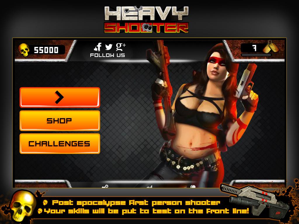 : Heavy Shooter is a post apocalypse fps first person shooting game where you are a rogue female assassin and killing is your duty.Shoot it out in four different battle fields; War Zone, Radiation, Crash Site and Quarantine. Accumulate skulls in game and upgrade your assault weapon and game perks. Your shooter skills will be put to test on the front line! Clear waves of enemies, unlock new levels and complete side challenges. A true call to arms.